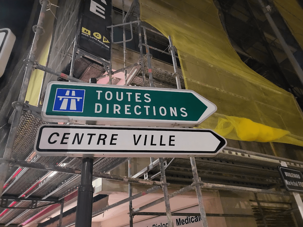 Den andra skylten är lika rolig – Centre Ville. I det här fallet Antibes, ett av mina favoritställen på Rivieran. Om ni flanerar runt i Antibes, särskilt utmed de lite större gatorna och vattenlinjen – håll koll på konsten som finns där. Dessa konstverk som finns på de ställningar som ni ser på bilden är konst av kända konstnärer som haft staden och utsikten man ser bakom bilden som motiv. Lite häftigt!
