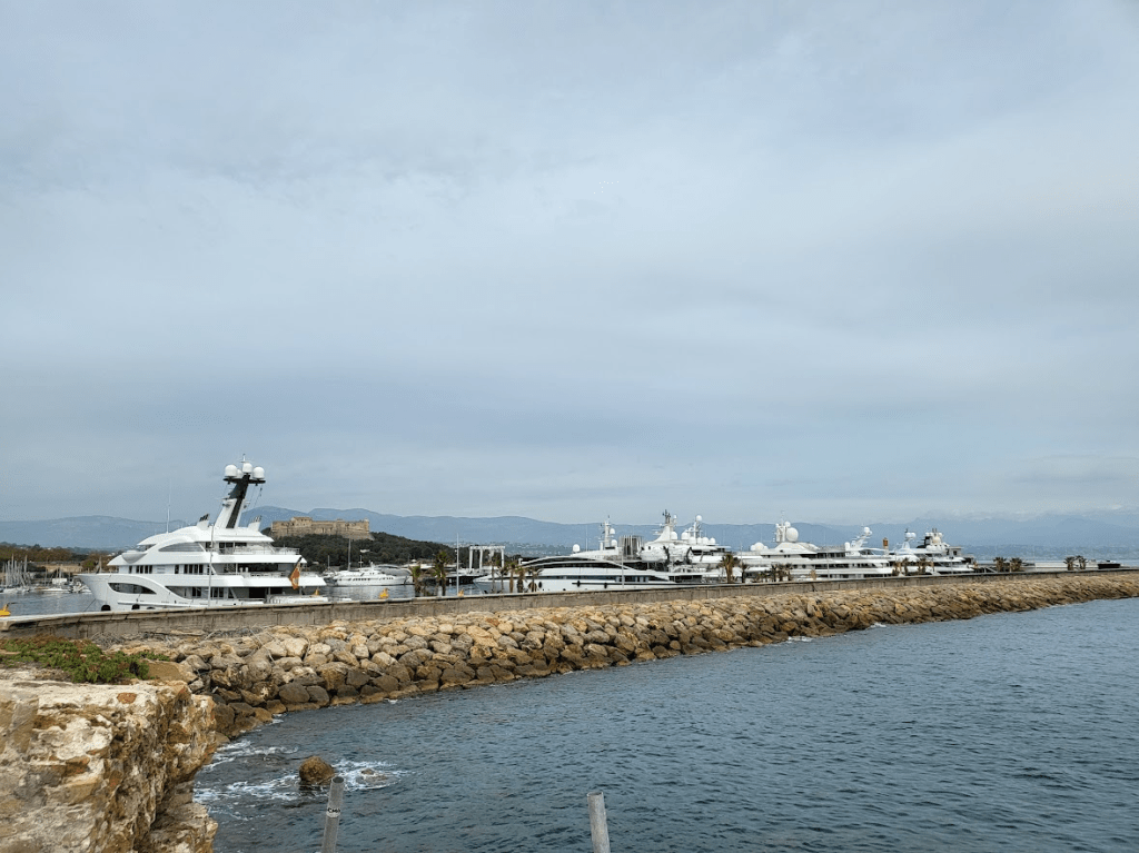 Men som vanligt kan vi konstatera att byggnationen är försenad. Man hade hoppats på att detta stora ombyggnadsprojekt, inte minst gångleden utmed muren på Quai des Milliardaires (miljardärernas hamn – ni förstår varför det heter som det heter när ni ser yachterna!).Det var meningen att man skulle blivit klar till denna sommar. Nu hoppas man bli klar med restaurering och ombyggnation till början av 2024. Det ska bli otroligt spännande att se hur det blir när allt är klart. Redan som hamnen var innan, var det här ett underbart ställe att gå omkring på. Här kan man njuta av vackra fartyg och följa vardagslivet på lyxyachterna – hur de putsas, angörs, far iväg. Och allt detta till en utsikt som heter duga – Le Fort Carré åt ena hållet med snöklädda alper (!) som bakgrund, havet åt andra hållet och Vieille Ville Antibes åt det tredje. Och ovanför seglar flygplanen in mot Nice Flygplats. Här är man i centrum av allt.