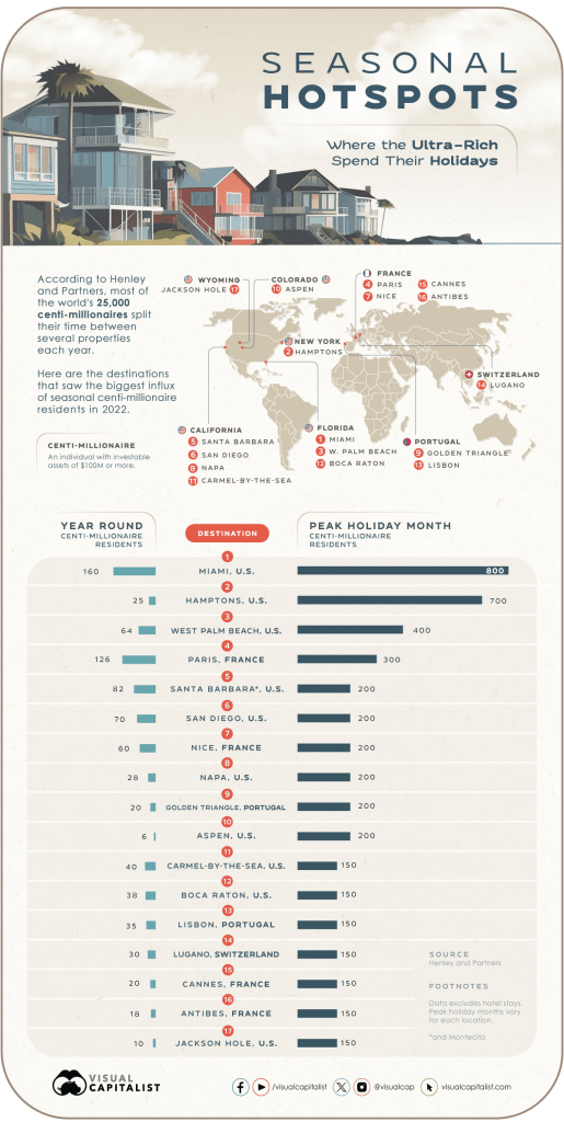 Franska Rivieran håller tydligt kvar sin plats i elitens hjärtan, såsom den gjort sedan 1800-talet. Såväl Nice som Cannes och Antibes toppar listan över populära resmål under semestern för världens miljardärer. Men inte bara det – det är också några av de få ställen i världen som lockar flest året-runt-boende miljardärer.