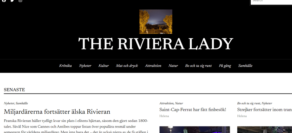 Nu har The Riviera Lady fått en sida med nytt utseende och nya härliga funktioner. Man kan till exempel prenumerera på våra utskick så slipper man undra vad som händer och fötter på Rivieran – allt dyker upp i din mail, utan besvär. Det är helt gratis och du anmäler dig med din e-mail-adress längst ner på förstasidan. Välkommen!