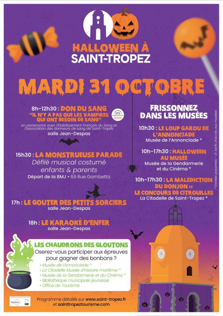 - Saint-Tropez bland annat firar högtiden med kostymparad, pumpatävling och karaoke, samt spökerier på muséerna och Citadellet