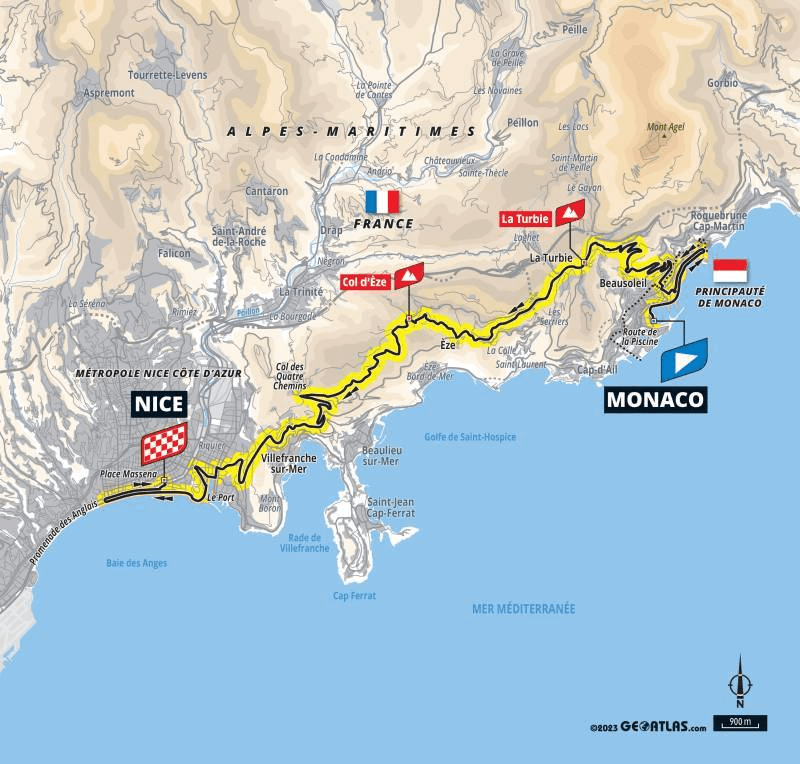Det blir två utmanande sträckor för cyklisterna på Rivieran. Den 20e juli går loppet mellan Nice och Col de la Couillole och den 21a juli går delsträckan mellan Place de la Mass’ena i Nices hjärta till Monaco. Det betyder att de sista sträckorna förläggs just här och inte i Paris och Champs-Elyssées som man brukar. Anledningen är säkerhetsskäl och att det krockar med OS i Paris. Så för första gången sedan 1905 får målgången bli på ett annat ställe -och det blir i vackraste, vackraste Nice.