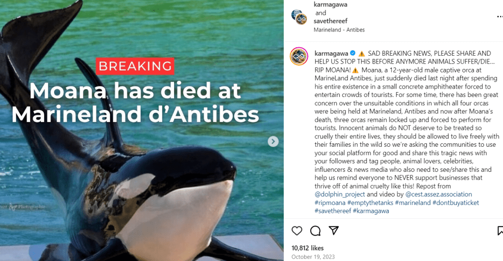One Voice har många djurälskare med sig i arbetet för att försöka förbättra livsvillkoren för späckhuggarna, och stödet har ökat på senare tid, inte minst sedan oktober då en av dem, Moana, hittades död i sin bassäng (något The Riviera Lady också skrivit om i detta inlägg). Djuret blev bara 12 år, vilket är mycket ungt i späckhuggarsammanhang.