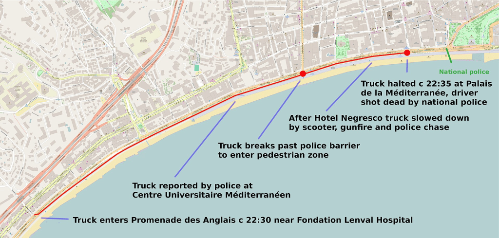 Lastbilen kör över folk hur som helst, mejar ner polisavspärrningen och åker i zick-zack genom en hysterisk folkmassa. Farten minskar med varje smäll (människa som träd/kantsten etc) och när den väl kommer till Negresco har polisen kommit ifatt den och skjuter mot den. En cyklist lyckas minska farten ytterligare, och försöker öppna förardörren men hotas med ett skjutvapen. En än modigare motorcyklist lyckas då slänga sin motorcykel framför lastbilen, vilket ytterligare hindrade lastbilen. Denna hjältemodiga man lyckades också komma upp på lastbilden och slå till föraren ordentligt innan han själv fick en rejäl smäll av föraren och trillar av lastbilen. Tack och lov blir denna man inte allvarligt skadad.