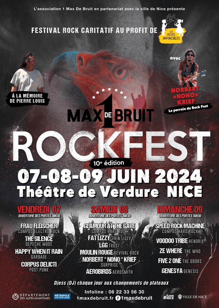 Ja det heter faktiskt så – trots det svenskklingande uttrycket är det Rock Fest på gång i Théâtre de Verdure i Nice. Och den pågår hela helgen 7-9 juni 2024. Det utlovas rock på längden och tvären med en mängd band – de som spelar egenkomponerat såväl sådana som spelar kända och mindre kända covers från band såsom Aerosmith, The Doors, Thin Lizzy, Genesis och till och med ”elektrisk rock” (vad det nu är 😉 ) med covers från till exempel mina favoriter Depeche Mode. Det kommer också finnas DJ:s på plats som rockar fett på dansgolvet.