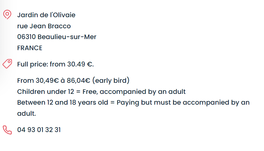 Platsen för konserterna under dessa tre dagar är Le Jardin de l’Olivaie, konserterna pågår mellan klockan 18.00 och 01.00 och man når platsen lätt till fots från tågstationen.