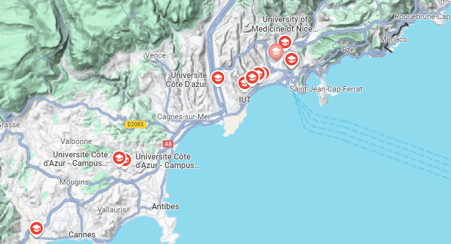 Université Côte d’Azur är ett av 80 universitet i Frankrike. Universitetet är statligt, etablerades år 2019 och är en sammanslagning av flera olika högskolor i området och universitetet i Nice. Universitet är mycket ambitiöst och rankas högt i Frankrike och Europa. Här kan man studera det mesta – entreprenörskap, kreativa ämnen, ekonomi, juridik, statsvetenskap, samhällskunskap, management, ekologi, biologi, kemi, medicin, odontologi, eller bli ingenjör. Och det här är ett universitet som hänger med i tiden – numera är AI en viktig del av universitetets satsning liksom astronomi.