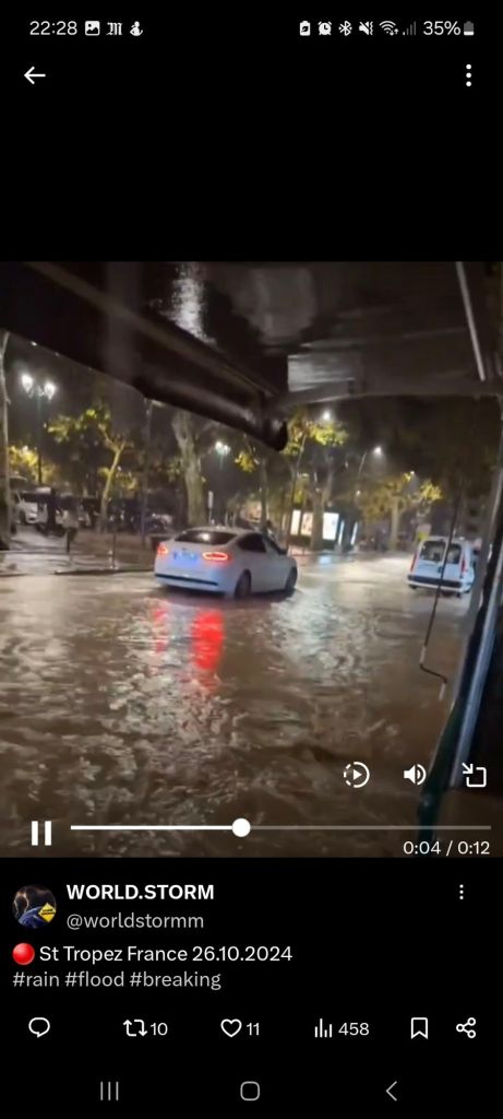 För tredje gången på kort tid har nu delar av Franska Rivieran drabbats av enorma skyfall som översvämmat byar. Den här gången, lördagen den 26 oktober, drabbades Var-regionen, det vill säga den västra regionen av området, av ett rejält regnoväder. 80 – 130 millimeter regnvatten kom på bara en timme och forsade ner utmed gatorna i bland annat Fréjus, Grimaud och Saint Tropez.