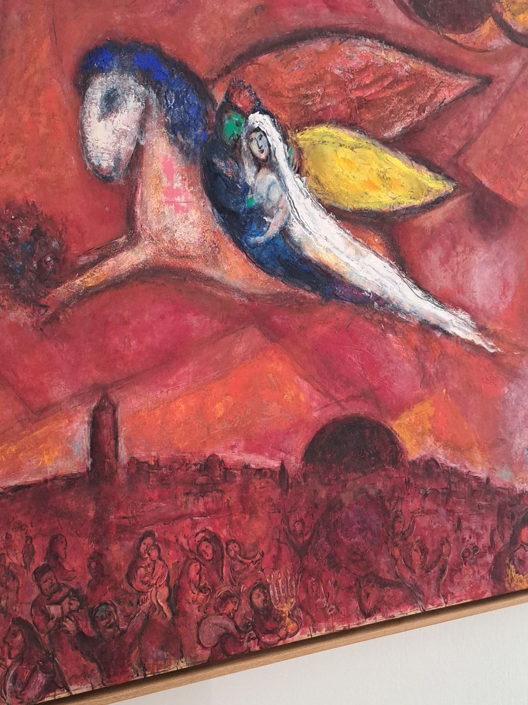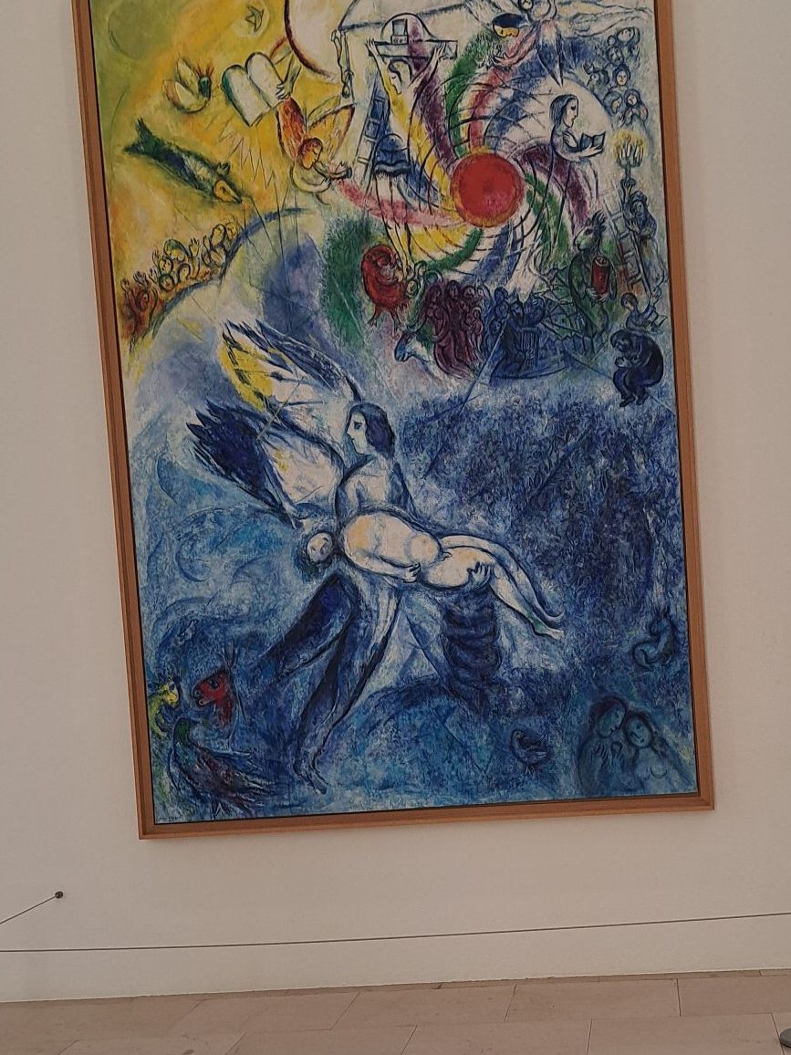 De verk som framför allt finns på Chagallmuseet i Nice är de som handlar om Gamla Testamentet. Inspiration till detta fick Chagall när han i början av 1930-talet fick chansen att åka till Tel Aviv, där han mötte sina gelikar. Här pratade man såväl jiddish som ryska, två språk som Chagall själv bemästrade, liksom den judiska kulturen i den då unga staden. Efter denna resa drömde han om Gamla Testamentet och gjorde ett antal målningar med bibliskt tema. Det finns så mycket mer att berätta om Chagall, men jag stannar där. Är man intresserad så rekommenderar jag vidare läsning på nästet – och givetvis ett besök på museet.